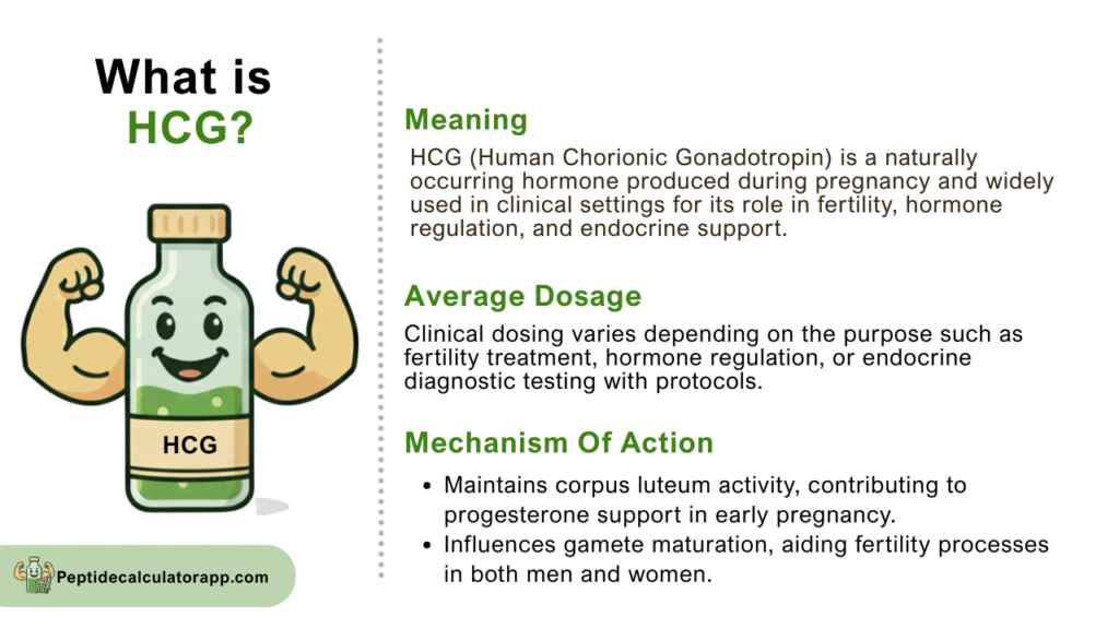 Human Chorionic Gonadotropin (HCG) is a hormone naturally produced by the placenta during pregnancy, specifically by the syncytiotrophoblast cells. Structurally, HCG consists of two subunits: an alpha subunit similar to other hormones like LH, FSH, and TSH, and a unique beta subunit that gives HCG its distinctive properties. The hormone reaches peak levels during the first trimester of pregnancy and gradually declines thereafter.